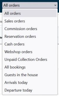 Firstly, you can filter the orders at the top left according to the categories All orders, Sales orders, Commission orders, Reservation orders, Cash register orders, Webshop orders, Unpaid move-in orders, All bookings, Guests in house, Arrivals today, Departures today so that only the orders that fit into the respective category are displayed.