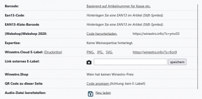Sobald Du für die E-Labels von Winestro.Cloud freigeschaltet wurdest, kannst Du an dieser Stelle den QR-Code und die passende Nährwerttabelle generieren.