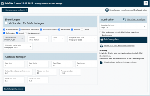 Wenn Du eine Einstellungen vorgenommen hast, die Du auch für alle zukünftigen Briefe beibehalten willst, aktiviere oben auf der linken Seite das Häkchen „Diese Einstellungen als Standard für zukünftige Briefe festlegen“.