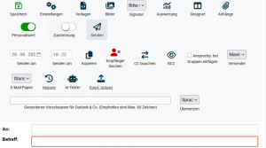Hier kannst Du den Betreff und den Text eingeben und rechts oben in die weiteren Reiter zu dieser E-Mail wechseln.