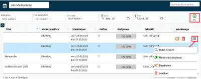 Über die Funktionen Meilensteine und Aufgaben im Programm kannst Du Dir einen Überblick über Deine Aufgaben verschaffen. Hier können Aufgabe nach Wichtigkeit sortiert werden, sowie jeweils Mitarbeitern zugeordnet werden. Beispielsweise kann hier ein Hoffest als Meilenstein angelegt werden und die verschiedenen Aufgaben, die erledigt werden müssen, unter diesem Meilenstein Hoffest gesammelt werden.