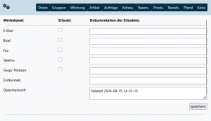 In der Kundenkarteikarte kannst Du hinterlegen, auf welchen Kanälen Du diesen zu Werbezwecken kontaktieren darfst. Beim Werbekanal E-Mail beispielsweise kannst Du beim Versenden eines Newsletters mit wenig Aufwand sicher stellen, dass nur Kunden, bei denen dieser Haken auch gesetzt ist, eine E-Mail erhalten. Mehr dazu unter Newsletter-Schnittstelle.