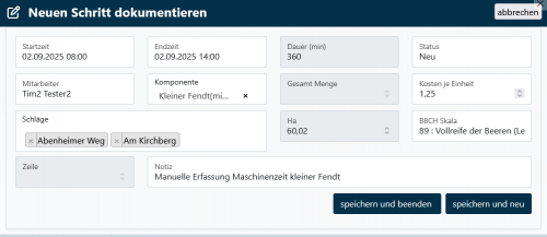 Wenn du auf speichern und neu Klickst, passiert grundsätzlich das Gleiche. Allerdings bleiben deine Eingaben in der Maske erhalten, damit du z.B. die Einträge für die nächste Komponente machen kannst ( Traktor, dann Mulcher ... ) Damit kannst du deinen vergangenen Arbeitstag schnell erfassen und hast damit immer einen Überblick und einen Nachweiß über die verwendeten Mengen, Zeiten und Kosten.