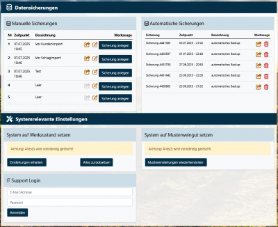 Mustereinstellungen wiederherstellen heißt, es werden alle Daten gelöscht und mit den Daten und Einstellungen des Musterweinguts ersetzt.