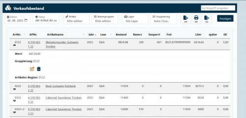- Gruppierung: Möglichkeit, die Liste nach Qualitätsstufe, Jahrgang oder Artikelnummer zu gruppieren.