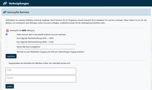 Wenn Du Winestro.Cloud mit mehreren Zugängen nutzt, kannst Du diese Zugänge kostenlos miteinander verknüpfen. So kannst Du schnell und einfach während der Arbeit mit dem Programm zwischen Deinen verschiedenen Betrieben hin- und herwechseln. Außerdem können die Betriebe damit auch untereinander interagieren, ihre Bestände einsehen und interne Abrechnungen abbilden. Du kannst also einfach und übersichtlich neben dem Weingut noch ein Gästehaus, eine Vinothek uvm. betreiben. Dazu stehen Dir eine Reihe von Möglichkeiten zur Verfügung.