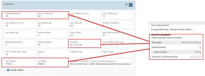 Mit der Einführung von E-Label sollen auch Weine im Onlinehandel (in deinem Shop) die gleichen Angaben haben. Die Konfiguration von Nährwerteangaben im Shop unterscheidet sich ein bisschen von E-Label. Aus der Artikelkarte werden folgende Felder an den Shop übertragen: Die notwendigen Analysewerte, Brennwerte, Vitamine, Zutatenliste, Labeltext, Checkbox "enthält Sulfite",Allergene/Antioxidm./Konservm. Im Shop werden die Felder wie folgt zusammengestellt: Nährwertetabelle Labeltext Zutatenliste + Allergene + checkbox "enthält Sulfite"