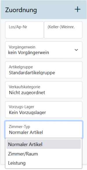 '''Zimmer''' werden wie gewöhnliche Artikel angelegt. In der Bearbeitungsmaske des Artikels kann der Artikeltyp gewählt werden (Artikel, Raum, Leistung). Bei der Erstellung kann die rste Belegzeile für die bennenung des Zimmer genutzt werden. In der zweiten Belegzeile können zusätzliche Angaben, wie die Raumnummer angeggeben werden. | '''Zimmer''' werden wie gewöhnliche Artikel angelegt. In der Bearbeitungsmaske des Artikels kann der Artikeltyp gewählt werden (Artikel, Raum, Leistung). Bei der Erstellung kann die rste Belegzeile für die bennenung des Zimmer genutzt werden. In der zweiten Belegzeile können zusätzliche Angaben, wie die Raumnummer angeggeben werden. | ||