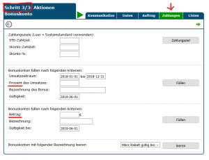 Dann gehen Sie in Schritt 3 der Selektion auf den Reiter Zahlungen. Hier finden Sie die Einstellmöglichkeiten zu den Bonuskonten.