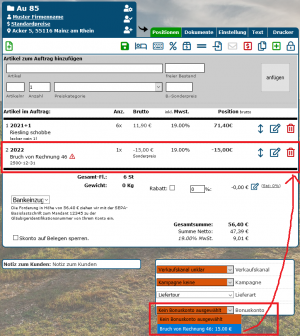 Hat ein Kunde ein Guthaben auf seinem Bonuskonto und Sie erstellen einen Auftrag für diesen Kunden, können Sie den Bonus mit einem Klick als Rabattposition einfügen.