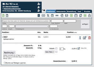 Für die Annahme eines bestimmten Produkts (z.B. Äpfel) und der korrekten Softkontenführung erzeugst Du zunächst wie gewohnt einen neuen Auftrag für den entsprechenden Kunden. Füge dem Auftrag das Sortiment an, welches Du für die Annahme des Produkts erstellt hast (z.B. Apfelannahme) und gib unter dem Punkt Anzahl die Menge an (z.B. 30 für 30 kg Äpfel). Erzeuge nun eine Rechnung. Sofern Du dem Sortiment keinen Preis vergeben hast, beträgt die Rechnung über die Apfelannahme 0,00 €.