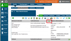 Klicken Sie bei einem Kunden auf das Symbol . Sie gelangen dann auf die jeweilige Kundenkarteikarte, wo Sie alle Informationen zu diesem Kunden erhalten. Nach dem neuen Anlegen eines Kunden, oder nach einem Editiervorgang werden Sie automatisch zur Übersicht und Kontrolle auf diese Kundenkarteikarte weitergeleitet.