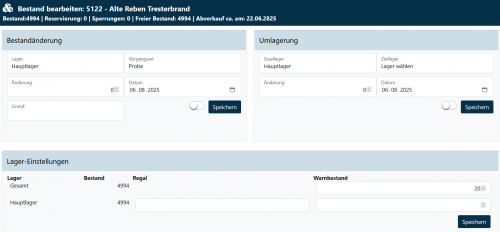 Das Bestandsmanagement gibt Dir Informationen über die jeweiligen Lagerbestände, Bewegungen (Abfüllungen, Aufträge usw.), eine Zusammenfassung der manuellen Vorgänge, sowie die Dokumentation von Reservierungen und Sperrungen.