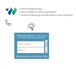 Um sich zukünftig (zum Test oder zur vollständigen Nutzung) anzumelden, gehen Sie erneut auf unsere Homepage und tragen Sie bei "Kunden-Login" Ihre E-Mail-Adresse und Ihr Passwort ein, klicken Sie dann auf Anmelden.