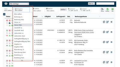 Zum anderen können unter "Status"die Aufträge nach einem bestimmten Belegstatus ("offen, unbezahlt, bezahlt, Fälligkeit überschritten, in Bearbeitung / Packliste") gefiltert werden. So kannst Du Dir z.B. nur die noch nicht bezahlten Aufträge anzeigen lassen und Dich direkt nur um diese kümmern, ohne Dich mühsam durch die einzelnen Aufträge klicken zu müssen.