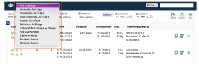 Zum einen kannst du die Aufträge oben links nach den Kategorien "Alle Aufträge, Verkaufs-Aufträge, Provisions-Aufträge, Reservierungs-Aufträge, Kassen-Aufträge, Webshop-Aufträge, Unbezahlte Einzugs-Aufträge, Alle Buchungen, Gäste im Haus, Anreisen heute, Abreisen heute" filtern, so dass nur die Aufträge angezeigt werden, die in die jeweilige Kategorie passen.