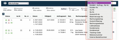 Alle ausgewählten Auftragslisten, auch mit entsprechend gesetzten Filtern, kannst Du durchsuchen, indem Du bestimmte Suchbegriffe in das Suchfeld eingibst. Es werden dann nur die Aufträge angezeigt, die der Suche entsprechen. Wird nur ein Auftrag als Ergebnis angezeigt, kann dieser mit der Entertaste direkt geöffnet werden. Um die Suche zu erleichtern, kannst Du im Drop-Down-Menü neben der Suchleiste eine Kategorie auswählen, in der Du nach Deiner Eingabe suchen möchtest. Wenn Du z.B. "Kunden-Nr." auswählst, wird nach deiner eingegeben Zahl ausschließlich im Kundennummern-Feld gesucht, nicht aber im Rechnungsnummern-Feld.