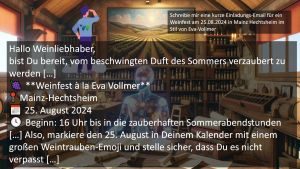 Liebe Weinfreunde, wir freuen uns darauf Sie am 29.10. zu unserem Weinfest in Mainz begrüßen zu dürfen und haben bereits alles für Sie hergerichtet. Genießen Sie einen schönen Abend mit leckeren Weinen in geselliger Runde. Mit besten Grüßen aus Mainz Ihr Weingut Mustermann