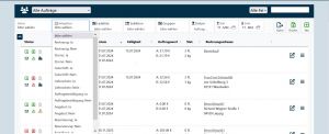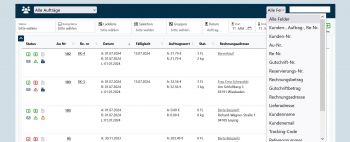 Zum einen kannst du die Aufträge oben links nach den Kategorien "Alle Aufträge, Verkaufs-Aufträge, Provisions-Aufträge, Reservierungs-Aufträge, Kassen-Aufträge, Webshop-Aufträge, Unbezahlte Einzugs-Aufträge, Alle Buchungen, Gäste im Haus, Anreisen heute, Abreisen heute,Aufträge mit Leasing,Aufträge mit Leasing-Auslieferung" filtern, so dass nur die Aufträge angezeigt werden, die in die jeweilige Kategorie passen.