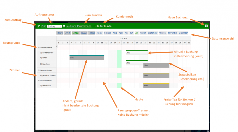 Der Buchungsklander soll Dir helfen, Buchungen schnell und übersichtlich zu verwalten. Buchungen sind Aufträge mit einigen Besonderheiten. Bitte lies vorher den entsprechenden Artikel Zimmer & Leistungen und Buchungsauftrag.