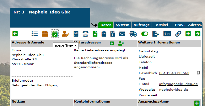Das vorliegende Foto zeigt, wie man aus einer Kundeakte heraus einen Termin erstellen kann.