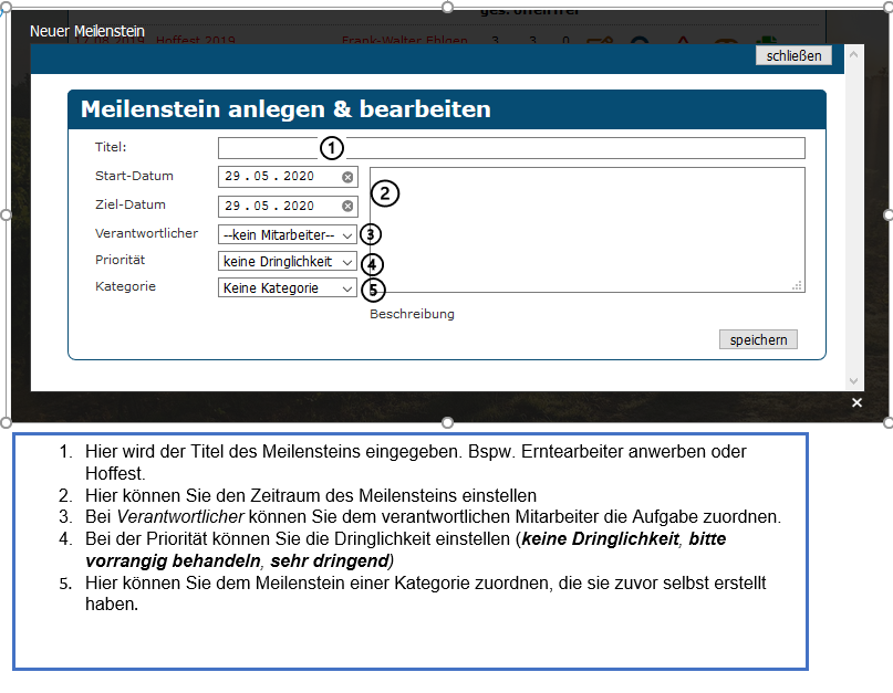 Erklärung + Legende zum Anlegen eines Meilensteins.