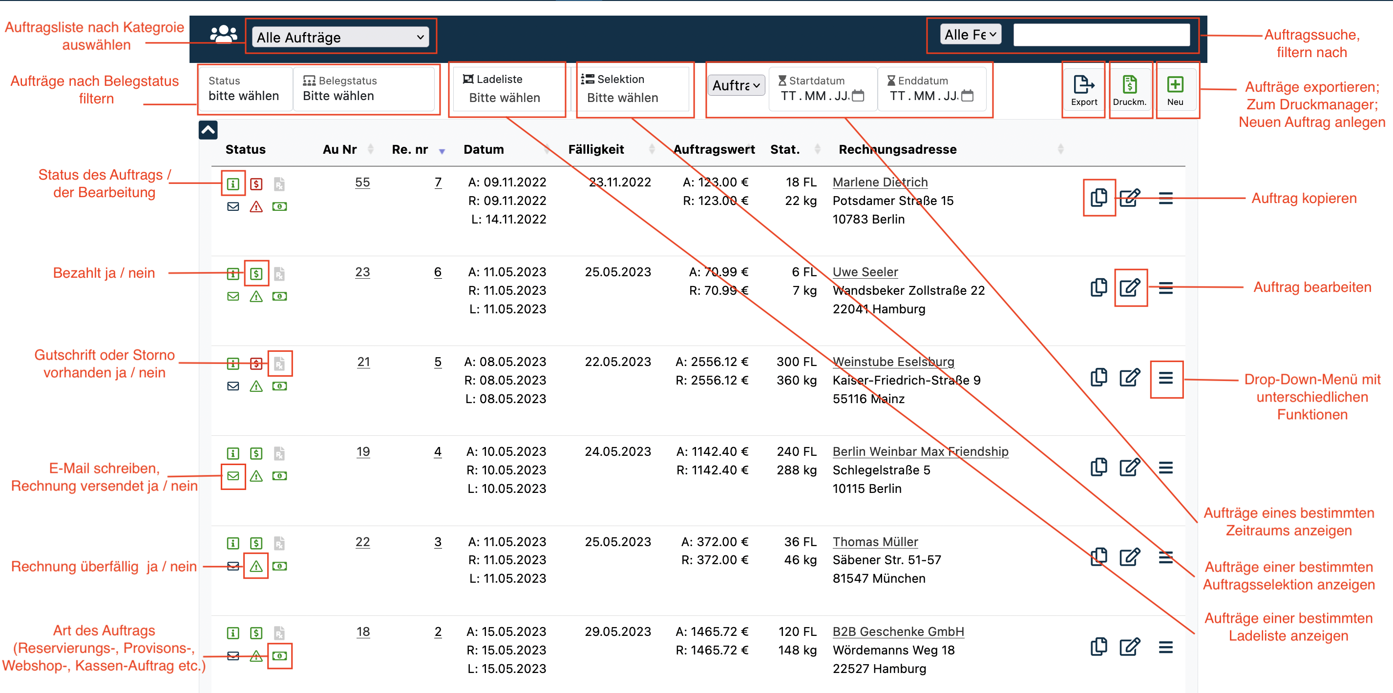 Beschriftung der einzelnen Symbole in der Auftragsliste