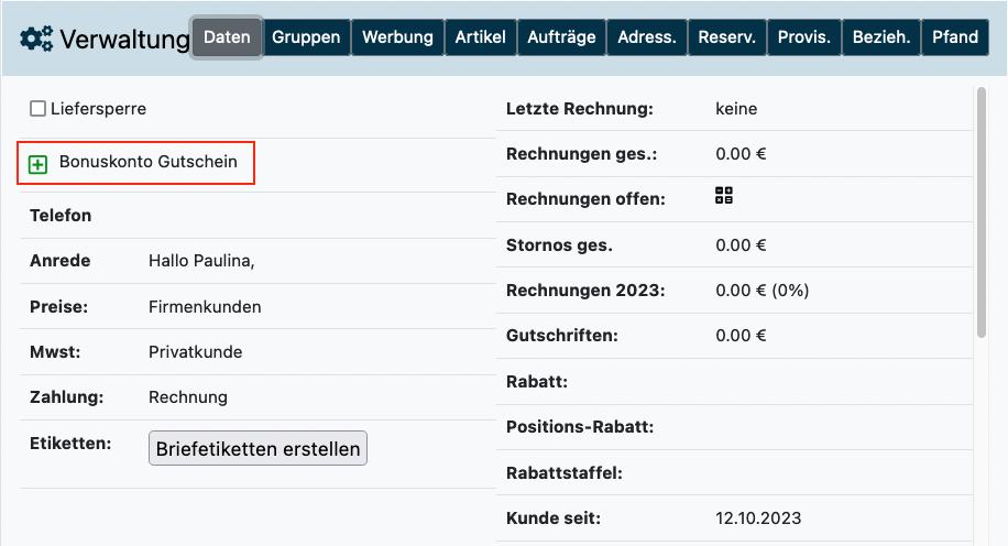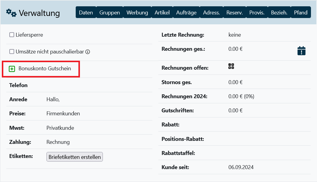 Anlegen Bonuskonto in der Kundenakte