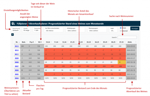 Der Füllplaner ist eine Hilfe für die Planung von Abfüllungen in den nächsten Monaten. Er berechnet die Bestände in der Zukunft auf Grundlage des historischen Verkaufsbestandes.
