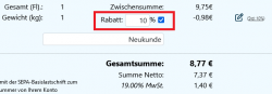 Du kannst einen Rabatt für den gesamten Auftrag festlegen. Aktiviere dazu das Kästchen Rabatt. Wenn der Kunde einen Standardrabatt eingetragen hat, wird dieser vorgeschlagen. Du kannst einen kundenspezifischen Standardrabatt beim Anlegen oder Editieren eines Kunden bestimmen. Klicke den Haken an, um einen Gesamtrabatt zu vergeben. Dieser kann entweder prozentual angeben werden, oder per Klick auf den Stift einen absoluten Betrag angeben (dieser wird dann in Prozent umgerechnet). Du kannst einen optionalen Grund für den Rabatt angeben. Außerdem wird Dir der Standardrabatt des Kunden dort angezeigt.