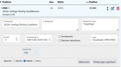 Um eine Position aus einem Auftrag nachträglich zu bearbeiten, klicke einmal auf den Stift bei der jeweiligen Position. Hier kannst Du jetzt die 1. und 2. Belegzeile anpassen oder ein internes Belegfeld anlegen. Zusätzlich ist es hier nun auch möglich die Flaschenanzahl und die Preiskategorie anzupassen, einen Sonderpreis festlegen und zu entscheiden, ob der Flaschenpreis im Auftrag mitberechnet werden soll. Die Möglichkeiten der Auftragsbearbeitung variieren, je nach Paket, dass Du nutzt.