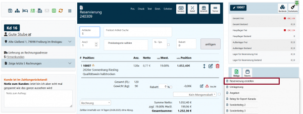Die Erfassung funktioniert analog zur Auftragsverwaltung: Du wählst den Kunden, fügst die gewünschten Artikel mit Menge und Lager in den Auftrag ein und erzeugst anschließend den Reservierungsbeleg (siehe rechtes Screenshot).