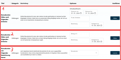 Du kannst nun für einen oder für mehrere Kunden gleichzeitig ein Bonuskonto einrichten. Dabei kannst du entweder einen prozentualen Betrag (s. Abb., 1) oder einen festen Betrag (s. Abb, 2) festlegen, der sich aus einem von dir festgelegten Umsatzzeitraum errechnet.