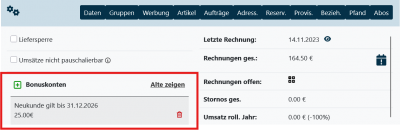 Alle erstellten Bonuskontenbeträge werden Dir ebenfalls in dem Reiter Daten angezeigt. Um einzelne Bounskonto Einträge wieder zu löschen, klickst du einfach auf das X-Symbol hinter dem entsprechenden Betrag.